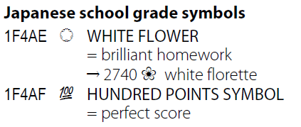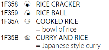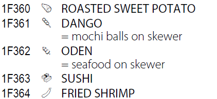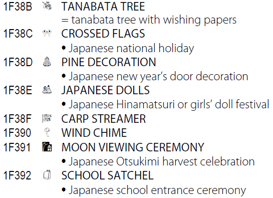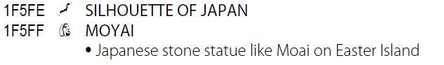 公開された表(Code Charts)を見ると、ケーキや団子、サクランボ、木々、動物、人物の顔(表情)、時計、富士山、東京タワー、自由の女神、日本列島のシルエット、(東京にある)モヤイ像などが含まれている。ジャンルとしては、ピクトグラム、感情系(スマイルマークなど)、交通系(電車・バスなど)などが含まれている。
